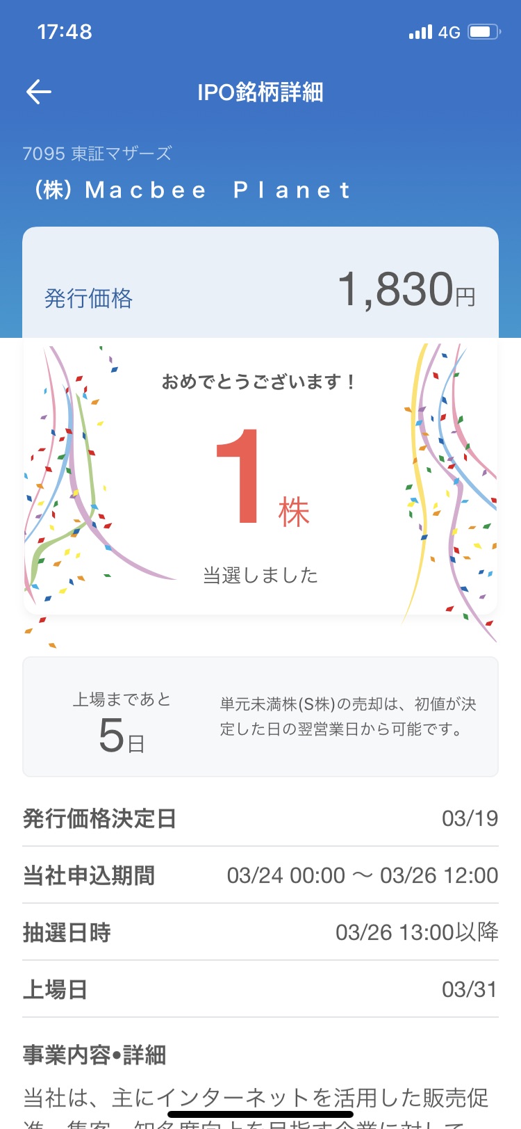今回は2銘柄ともそれぞれ4~5株申込んで1銘柄1株当選しました。