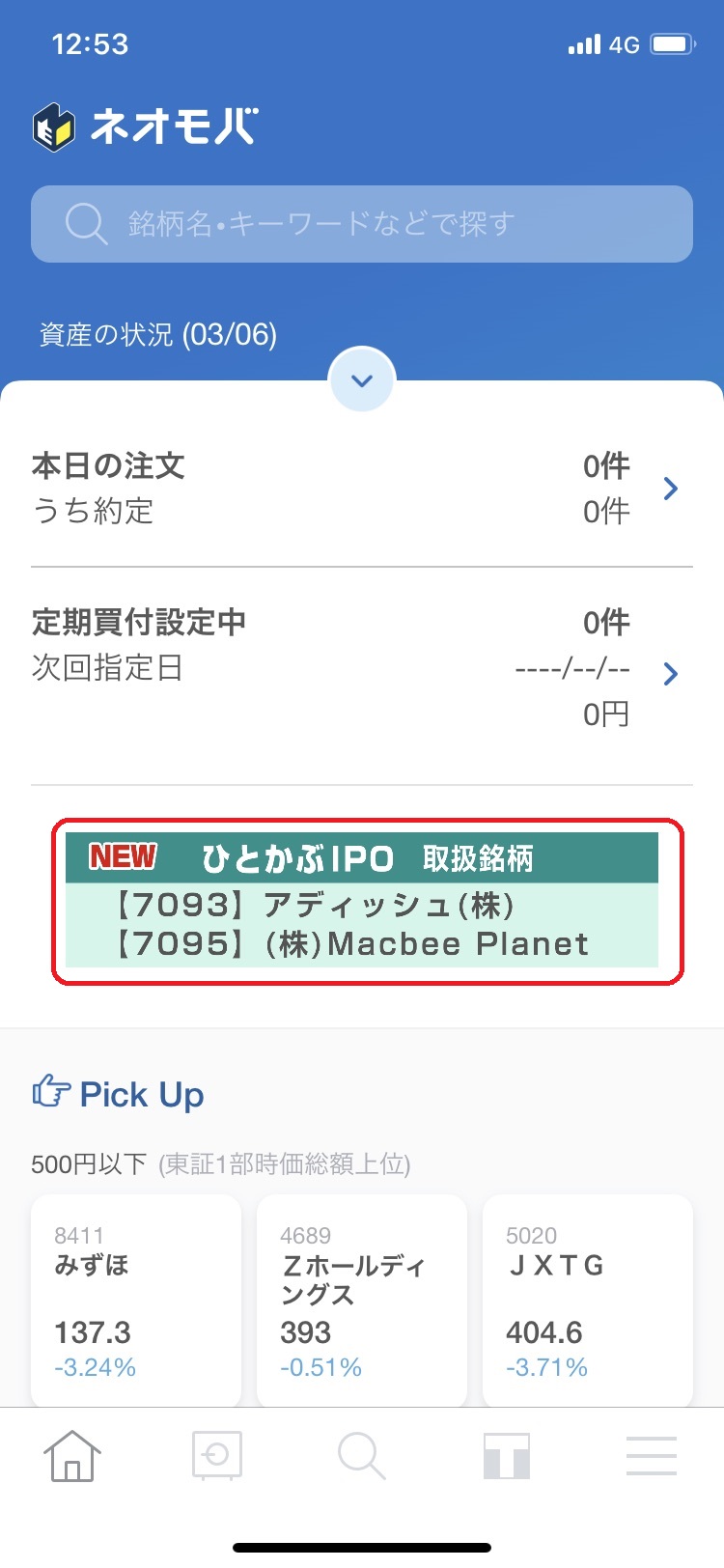 ①スマホのネオモバアプリを開きます。IPOの時期になると「取扱銘柄」がでるのでタップします。
